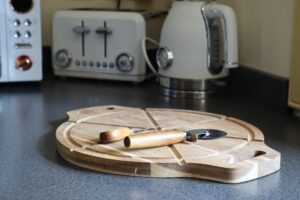 A separate utility room has a washing machine, tumble dryer, clothes rail, and an iron and ironing board. There is also a highchair which is kept in here.